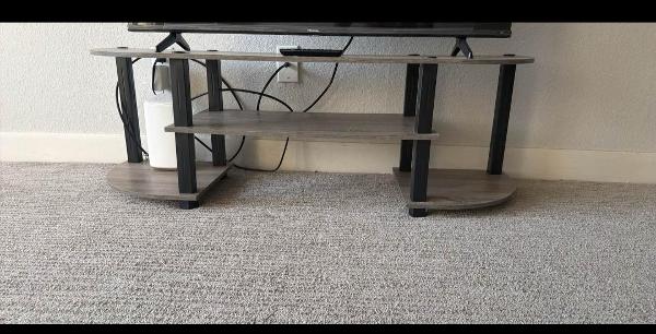 Gray wood and black metal 3-tier corner TV stand. Top shelf is 47.2 inches wide and 13.4 inches deep. Has holes for cable management. Middle shelf is 6.7 inches below top shelf and 22.2 inches wide. Bottom shelf is 15.7 inches high and 22.2 inches wide. Sturdy and great for holding TV and media devices.